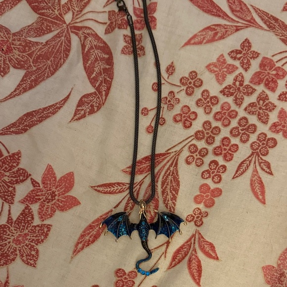 Stunning dragon pendant necklace with blue and black details. Perfect for adding a mystical touch to any outfit.