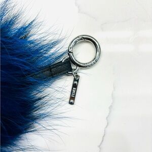 Stylish keychain featuring blue fur and black leather with striking yellow accents. Perfect for adding flair to your accessories.