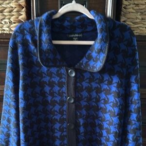 Stylish blue and black houndstooth coat with large buttons and pockets. Perfect for a chic look. Blue and Black Houndstooth sweater Coat in size 2x