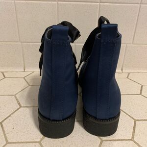 These lace-up boots feature a durable navy blue sateen upper paired with a robust black outsole, perfect for outdoor adventures. The metal eyelets and thick ribbon laces ensure a secure fit, while the substantial sole provides excellent traction and support. Designed for both comfort and longevity, these boots are ideal for those seeking a blend of style and functionality. These are womens size 8
