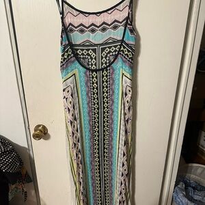 This elegant maxi dress showcases a striking combination of blue and black, perfect for a casual resort setting. The sleeveless design with spaghetti straps offers a breezy feel, while the flowing fabric ensures comfort and style. Its intricate patterns add a touch of bohemian flair, making it a standout piece for warm weather occasions.