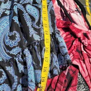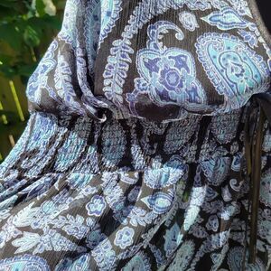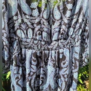 Blue and Black sheer Paisley pattern blouse over Black tank/cam. It gathers at the waist, the sleeves are half length, and have elastic on the end.