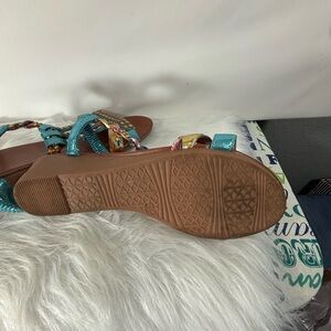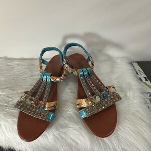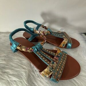 Blue and Brown Beaded Faux Leather Sandals with Ankle Straps