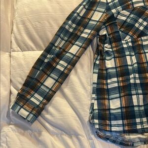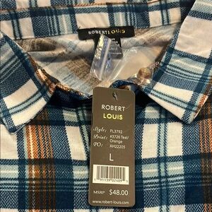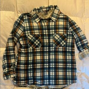 This top features a classic button-down style with a striking blue and brown plaid pattern. Tab sleeves to wear rolled up or down. Material is a buttery soft poly-spandex blend with a bit of stretch. Crafted for comfort and versatility, it's perfect for casual outings or as a stylish layering piece. Brand new boutique overstock, multiple sizes available.