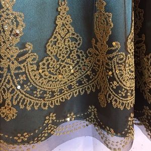 This strapless blue dress is gorgeous with golden brown embellishments along the bottom! Blue bottom layer with brown net material over laying. Only worn three times, great condition! Make an offer.