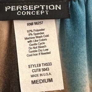 The Perseption Concept Flowy Multicolor Top in size M is a stylish blouse with a geometric pattern and 3/4 sleeves, perfect for casual occasions. Made of polyester and spandex knit fabric, this top features a collarless design and regular fit. With a basic style and colorful pattern, this top from the brand Perseption Concept is a versatile addition to any woman's wardrobe, representing a unique and trendy concept in women's clothing.