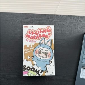 Quirky vinyl face toy with a playful design. Features a character in blue and brown.