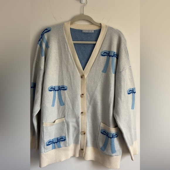 Stay cozy and stylish with this blue and cream cardigan sweater. Perfect for layering, this sweater adds a touch of elegance to any outfit.
