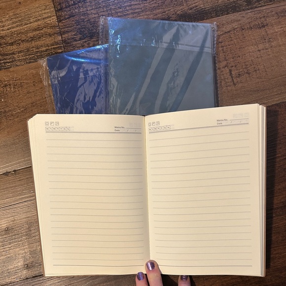 Organize your thoughts with this elegant blue and cream notebook set. Perfect for home office use. You will receive the two notebooks sealed in the packaging.