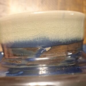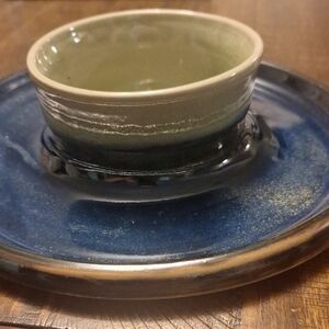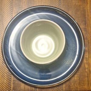 Chip and dip platter. Handcrafted pottery. platter measures 10" dip bowl is approx 16oz. Colors are blue, brown, and green.