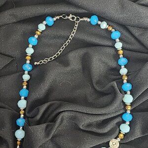 Blue and Gold Beaded Silver Tone Flower Faux Turquoise Pendant Boho 18" Necklace