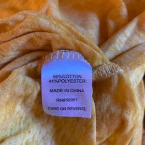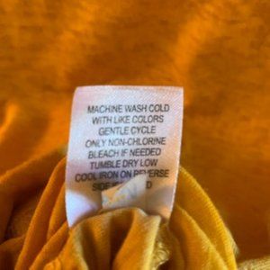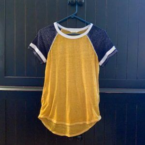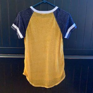 Gently loved, thin comfy blue, gold and white t-shirt. Great for layering, slightly longer in back.