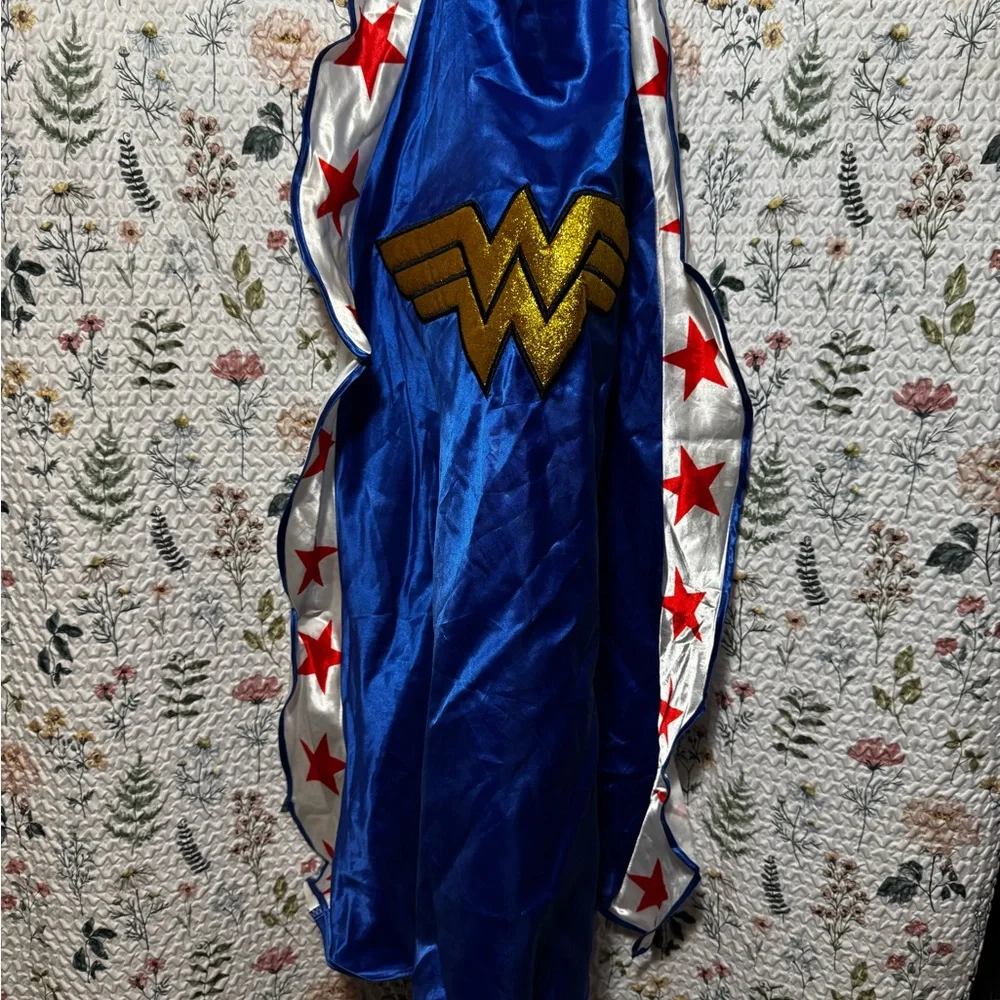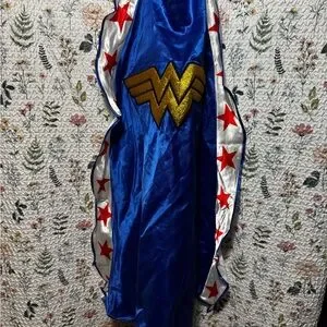 Transform into a superhero with this striking blue and gold Wonder woman cape and patriotic tights. Features iconic emblem and star accents. Ideal for playtime and parties.