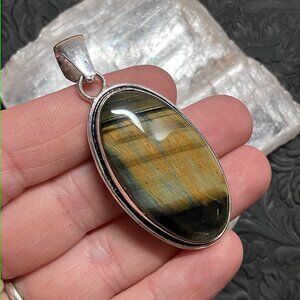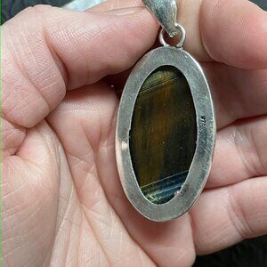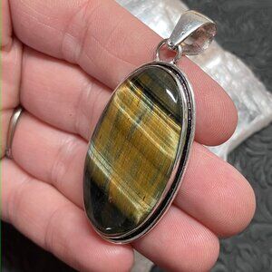 Pendant of a natural blue and yellow tiger's or hawk eye crystal stone in a simple 925 silver plated frame.