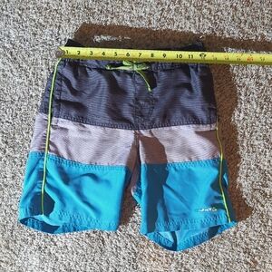 Stylish board shorts featuring a blue and gray color block design. Includes a drawstring for adjustable fit.