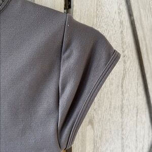 Gray one is nice double layer of fabric. Cut out is the back. No tag but fits like a small.