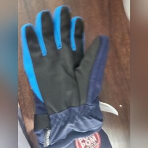 Stylish blue and gray winter gloves with a pom-pom detail. Perfect for cold weather.