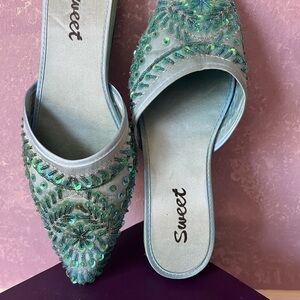 These mules feature a stunning blue and green embroidered design with intricate floral and paisley motifs. The pointed toe and luxurious embellishments add a touch of elegance, making them perfect for any sophisticated occasion. Crafted from high-quality fabric, these shoes offer both style and comfort. There is slight yellowing around the heel area and the inside of the mule. Please see all photos and video. Thank you!