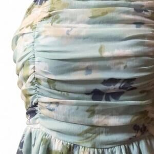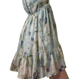 Blue, white, and green floral babydoll dress with ruffles, stretchy and comfy. Very gently used, with no visible flaws.