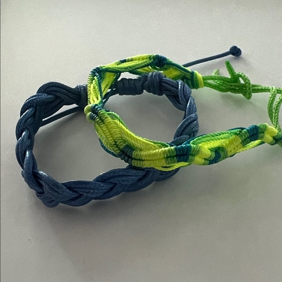 Set of two braided friendship bracelets in blue and green. Stylish and vibrant.