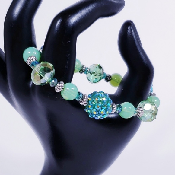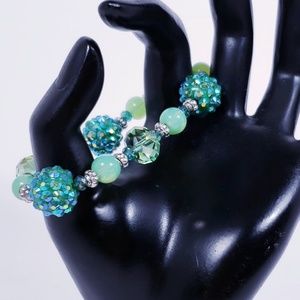 Blue, Green & Silver Glittering Elegant Beaded Stretch Bracelet