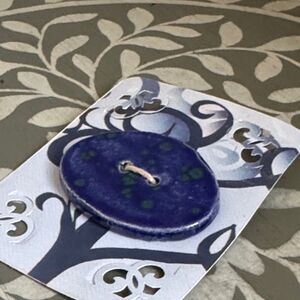 Unique handmade ceramic oval 2 hole button with blue and green design. Perfect for crafts or clothing. New on card