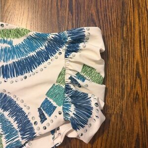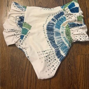 Two piece women's swimsuit with ruffle one shoulder top. Bottom has side ruching and medium bottom coverage.