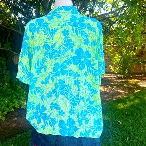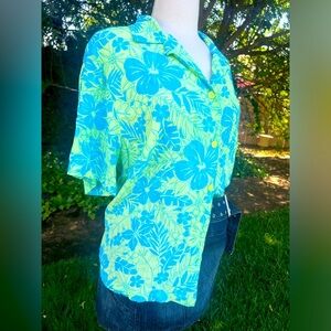 Embrace a relaxed style with this vibrant button down shirt, featuring a striking blend of blue and green hues. The short sleeves and notched collar add a touch of casual elegance, making it perfect for warm weather outings. Its boxy, relaxed fit ensures comfort and effortless style.