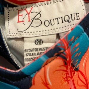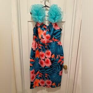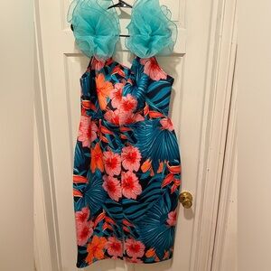 Embrace the vibrant spirit of resort wear with this sleeveless sundress, featuring a striking blue and orange floral pattern. The halter neckline adds a touch of elegance, making it perfect for a sunny getaway. Its midi length offers a chic and comfortable fit for any tropical adventure.
