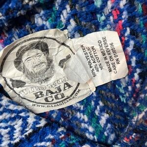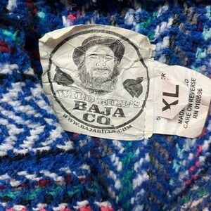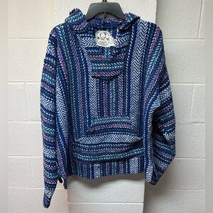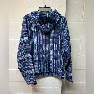This sweater features a fun design in a blend of blue and pink hues, offering both style and warmth. Its soft knit fabric ensures a cozy fit, making it ideal for cooler days. Please see picture hole on seam by hood.