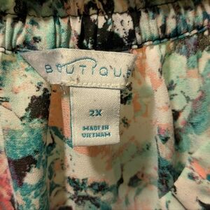 This relaxed blouse features a charming ruffled design with flowy sleeves, offering a stylish and comfortable fit. The vibrant soft green and pink hues add a touch of elegance, making it a versatile addition to any wardrobe. Perfect for a casual day out or a relaxed evening gathering.
