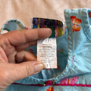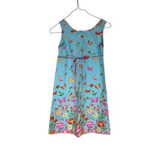 This casual sundress features a vibrant blue and pink color palette, perfect for resort wear. The sleeveless design and scoop neckline offer a breezy, comfortable fit ideal for warm weather. Its whimsical floral and butterfly print adds a touch of charm to any casual outing. This dress is a little girl’s dream.