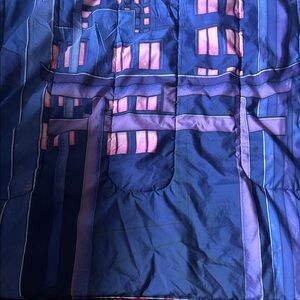 Experience comfort and style with this vibrant blue and purple cityscape comforter. Perfect for adding a modern touch to your bedroom decor.