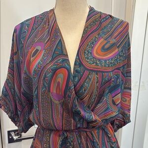 This stunning midi sundress is perfect for a wedding guest or cocktail event, featuring a vibrant blue and purple pattern. The dress boasts a flattering V-neckline and 3/4 length Dolman sleeves, with a cinched waist that flows into a graceful skirt. Crafted from a light, drapey fabric, it offers both elegance and comfort. In perfect condition.