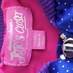 Stylish blue jacket with purple ruffles and colorful stripes. Perfect for adding a pop of color to any outfit.