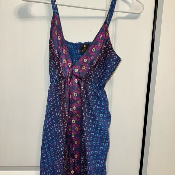 This stunning sundress features a deep blue base with a vibrant purple panel, perfect for casual or resort wear. The sleeveless design with spaghetti straps offers a breezy and comfortable fit, ideal for warm weather outings.
