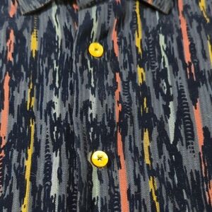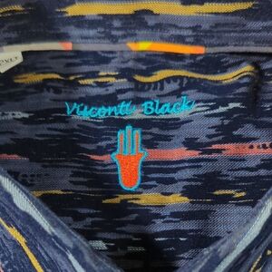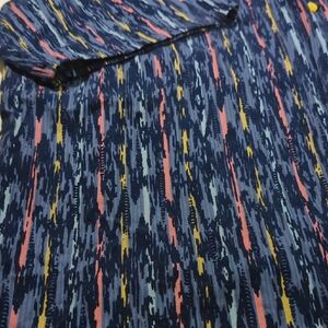 This casual button-down shirt features a striking artistic pattern with a blend of blue and red hues. The design offers a modern and dynamic look, perfect for adding a touch of creativity to your everyday style. Its long sleeves and collar make it a versatile choice for casual outings. This was a personal shirt. it's an absolute amazing shirt. I'm just tired of it, under certain black lights it does glow with some sort of neon look to it. It is a absolutely solid, well built shirt.. definitely will stand out and be one of a kind amazing shirt for hot summer days. also worn with shorts...