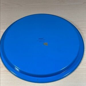 About 13.5” across and 0.75” deep. Thin metal, not completely flat on bottom.