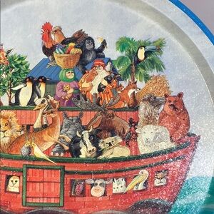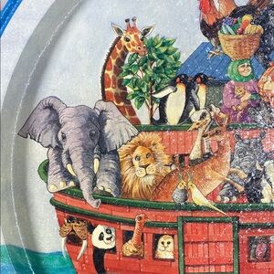 This decorative, lightweight tray showcases a vibrant Noah's Ark theme with striking blue and red accents. The central ark, adorned in a bold red, contrasts beautifully against the serene blue water and sky. Perfect for adding a playful touch to any decor, this piece captures the whimsical essence of a classic story. Would be great in a kids room or church Sunday School.