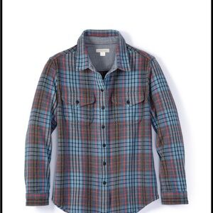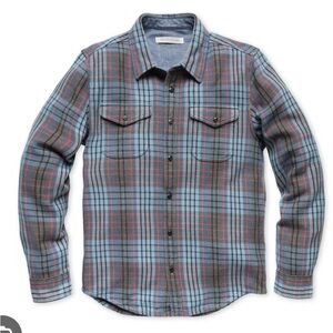 Navy plaid shirt with red accents. Features a classic collar and button-up front. Made by Outerknown.