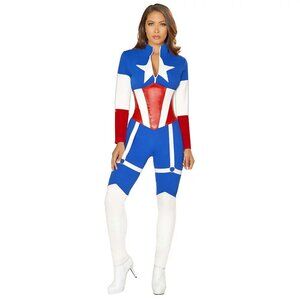 Stand out in this vibrant blue and red jumpsuit featuring a striking star design. Perfect for making a bold statement.