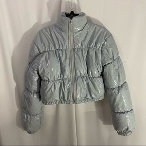 This bomber jacket features a sleek and shiny finish in a striking blue and silver color palette. Its classic bomber style is enhanced with a modern touch, making it a versatile piece for any wardrobe. The jacket's design ensures both comfort and style, perfect for cooler weather.