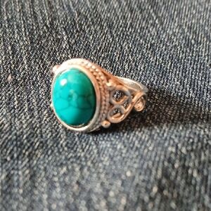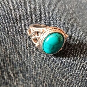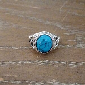 This striking ring showcases a vibrant blue turquoise stone set in a sleek silver band. The simple yet elegant design highlights the natural beauty of the turquoise, making it a standout piece in any jewelry collection. Ideal for those who appreciate timeless style and craftsmanship.