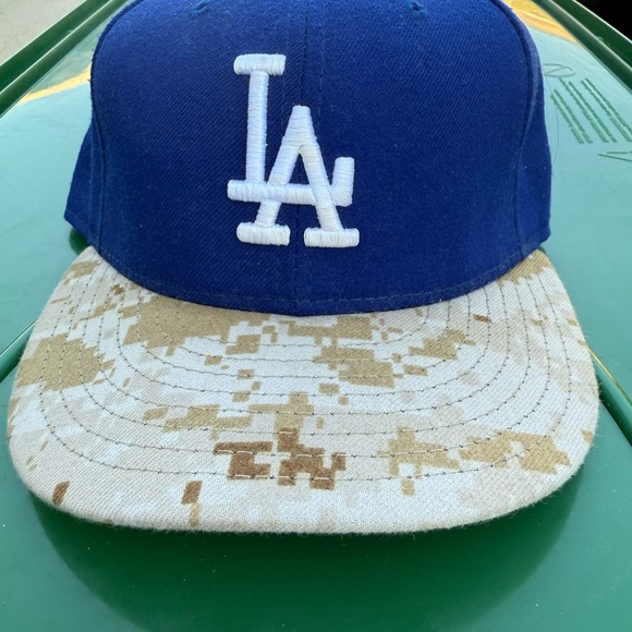 Stylish blue cap with LA logo. Features a tan camouflage brim.