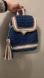 Stylish crochet backpack in blue and tan, perfect for everyday use. Features a unique braided design with a tassel accent.