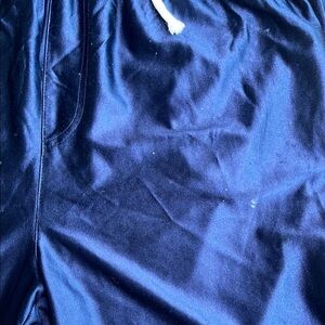 These athletic shorts feature a navy blue color with white stripes, crafted from a smooth, synthetic fabric for enhanced performance. The elastic waistband with a drawstring ensures a secure fit, while the loose design offers comfort and freedom of movement. Perfect for sports activities, these shorts provide a stylish and functional option for active wear.