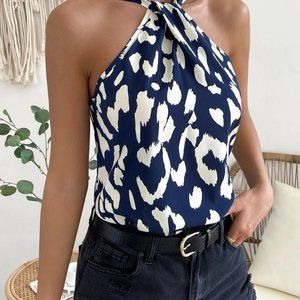 Blue and White Boho Womens Allover Print Halter Neck Blouse