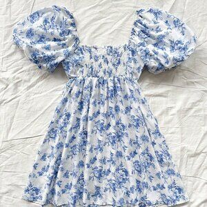 Blue and White Boho Women's Holiday U-Neck Bubble Sleeve A-Line Floral Dress