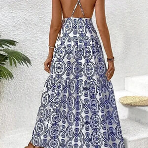 Blue and White Boho Women's Printed High Side Slit Backless Cami Dress