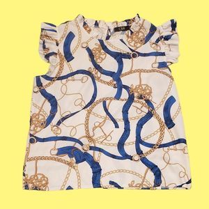 Stylish blue and white and gold blouse. Brand: CBR Size: Large (however can fit a medium sized body) Preloved but in great condition